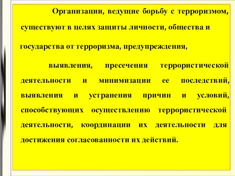 выявления, пресечения террористической деятельности и минимизации ее последствий, выявления и устранения причин и условий, способствующих осуществлению террористической деятельности, координации их деятельности для достижения согласованности их действий.