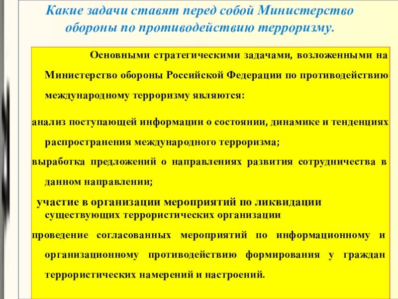 Основными стратегическими задачами, возложенными на Министерство обороны Российской Федерации по противодействию международному терроризму являются: