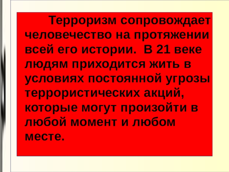 его истории. В 21 веке людям приходится жить в условиях постоянной угрозы террористических акций, которые могут произойти в любой момент и любом месте.