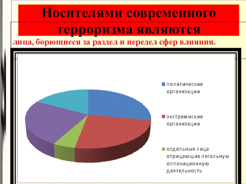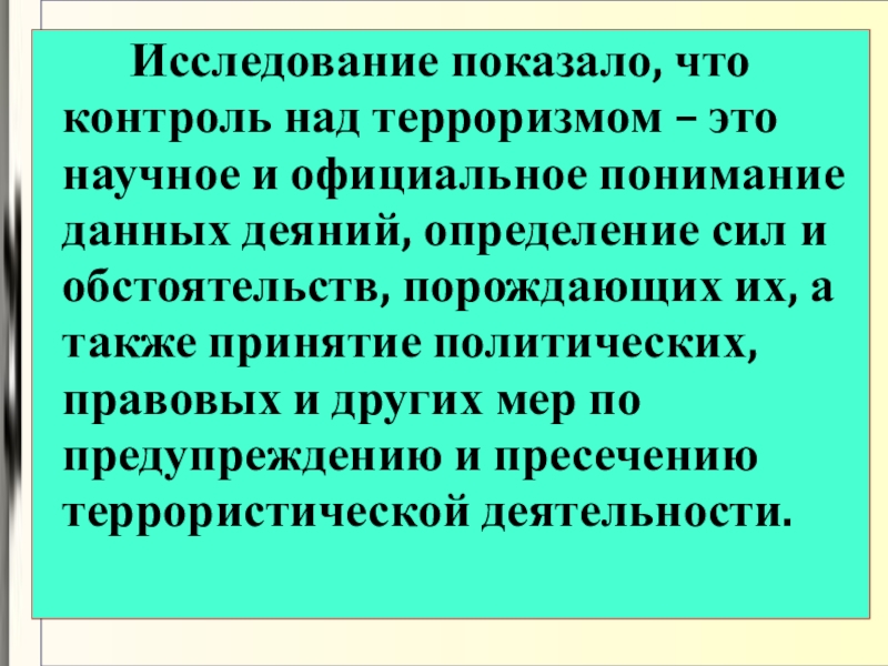 терроризмом – это научное и официальное понимание данных деяний, определение сил и обстоятельств, порождающих их, а также принятие политических, правовых и других мер по предупреждению и пресечению террористической деятельности.
