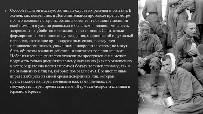 Слайд 10Особой защитой пользуются лица в случае их ранения и болезни. В