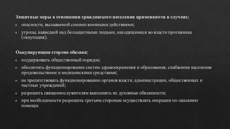 Слайд 17Защитные меры в отношении гражданского населения применяются в случаях: