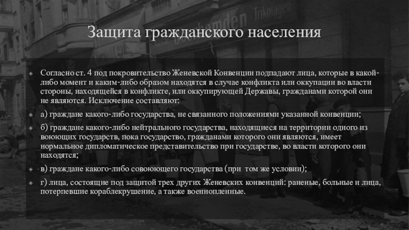 которые в какой-либо момент и каким-либо образом находятся в случае конфликта или оккупации во власти стороны, находящейся в конфликте, или оккупирующей Державы, гражданами которой они не являются. Исключение составляют: