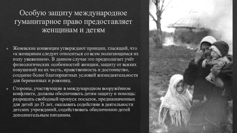 Слайд 18Особую защиту международное гуманитарное право предоставляет женщинам и детям