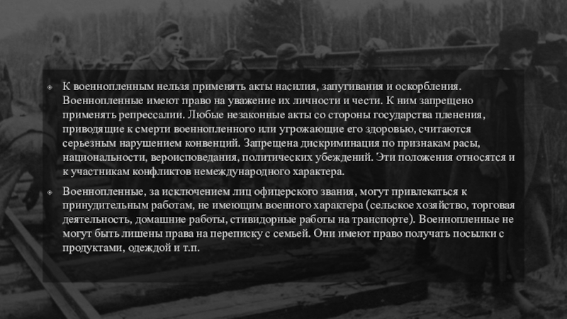 Слайд 9К военнопленным нельзя применять акты насилия, запугивания и оскорбления. Военнопленные имеют