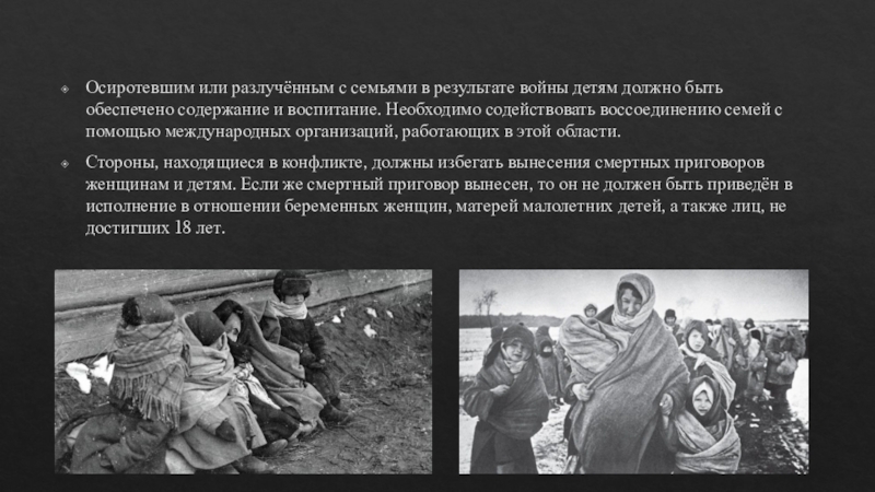 Слайд 19Осиротевшим или разлучённым с семьями в результате войны детям должно быть