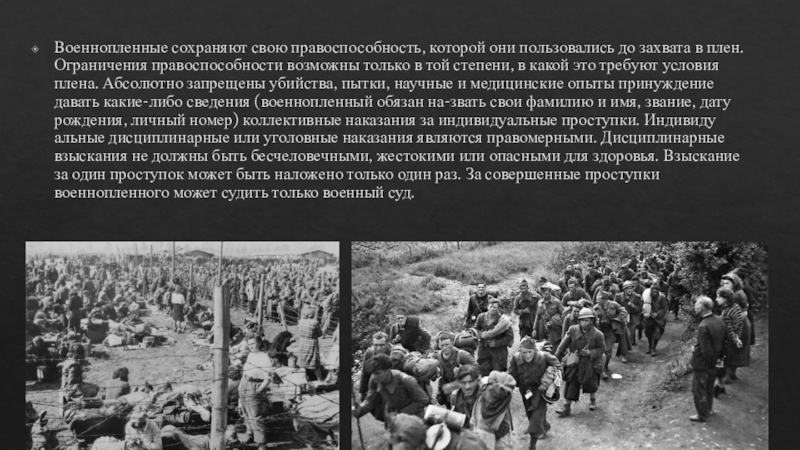 Слайд 8Военнопленные сохраняют свою правоспособность, которой они пользовались до захвата в плен.