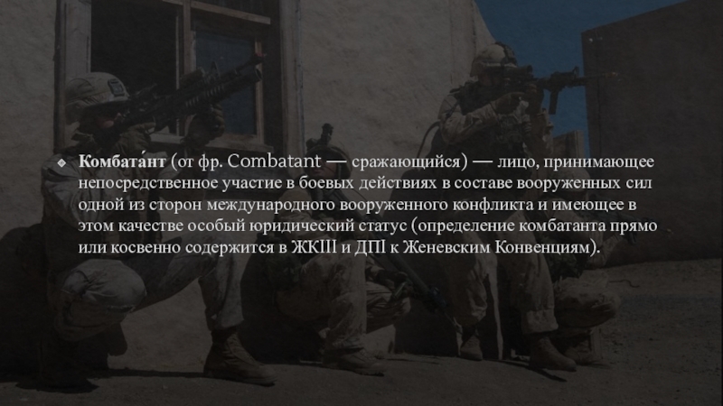 Слайд 4Комбата́нт (от фр. Combatant — сражающийся) — лицо, принимающее непосредственное участие