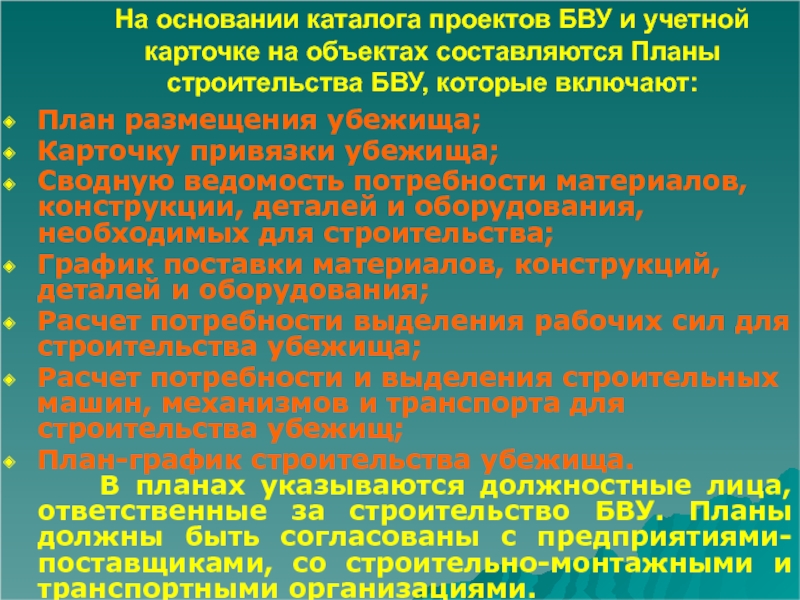 В планах указываются должностные лица, ответственные за строительство БВУ. Планы должны быть согласованы с предприятиями-поставщиками, со строительно-монтажными и транспортными организациями.