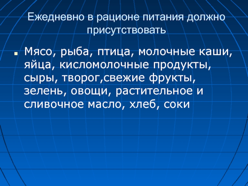Слайд 17Ежедневно в рационе питания должно присутствовать