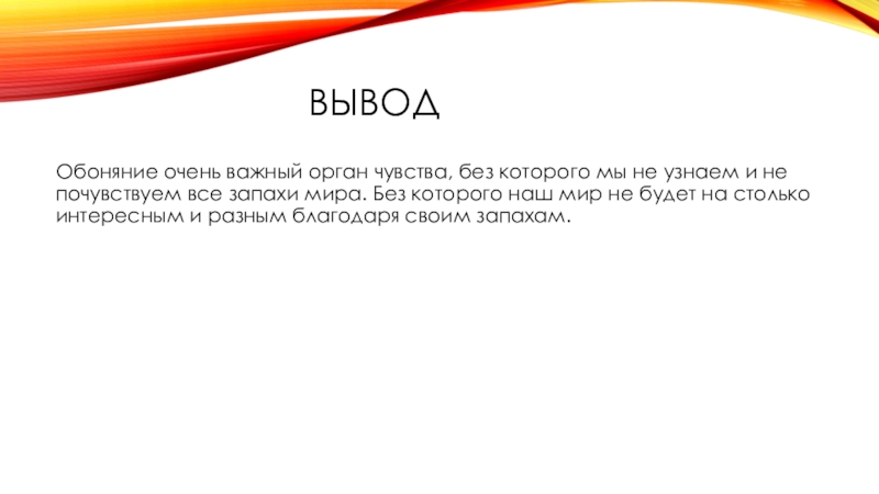 ВыводОбоняние очень важный орган чувства, без которого мы не узнаем и не почувствуем все запахи мира. Без