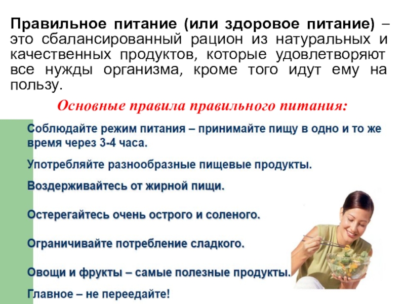 Основные правила правильного питания:Правильное питание (или здоровое питание) – это сбалансированный рацион из натуральных и качественных продуктов,