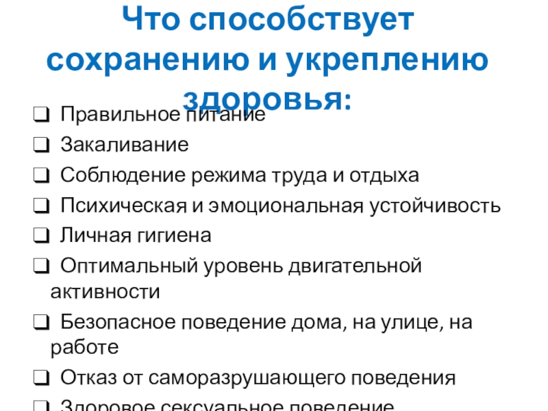 Слайд 10Что способствует сохранению и укреплению здоровья: