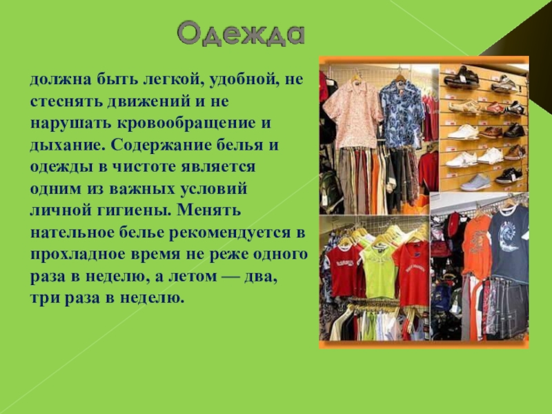 и дыхание. Содержание белья и одежды в чистоте является одним из важных условий личной гигиены. Менять нательное белье рекомендуется в прохладное время не реже одного раза в неделю, а летом — два, три раза в неделю.