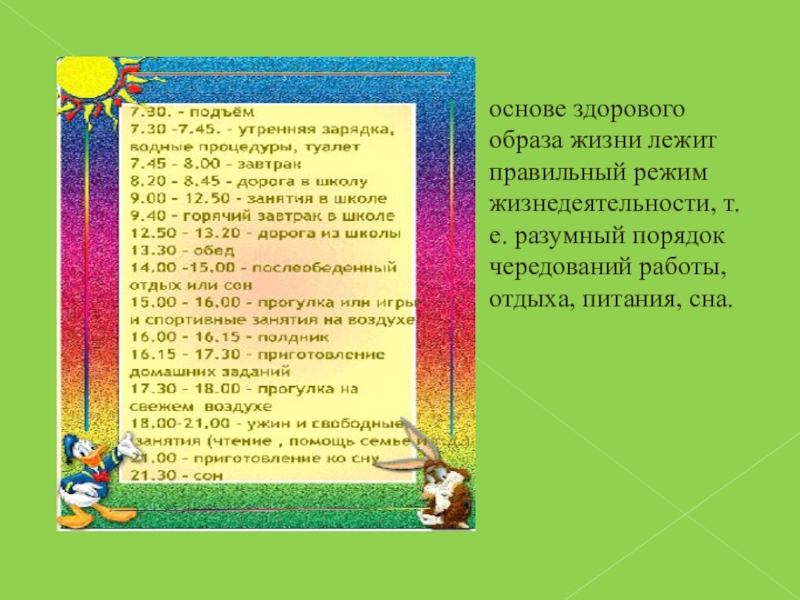 Слайд 11основе здорового образа жизни лежит правильный режим жизнедеятельности, т.е. разумный порядок