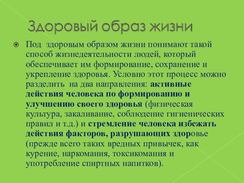 им формирование, сохранение и укрепление здоровья. Условно этот процесс можно разделить на два направления: активные действия человека по формированию и улучшению своего здоровья (физическая культура, закаливание, соблюдение гигиенических правил и т.д.) и стремление человека избежать действия факторов, разрушающих здоровье (прежде всего таких вредных привычек, как курение, наркомания, токсикомания и употребление спиртных напитков).