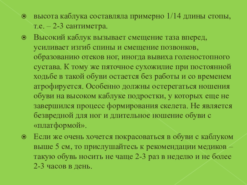 Слайд 18высота каблука составляла примерно 1/14 длины стопы, т.е. – 2-3 сантиметра.