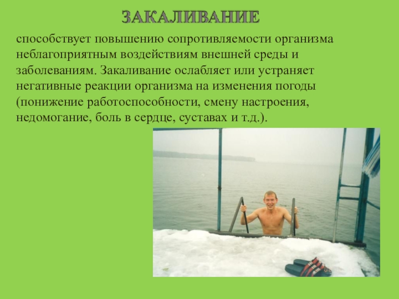 Слайд 7способствует повышению сопротивляемости организма неблагоприятным воздействиям внешней среды и заболеваниям. Закаливание