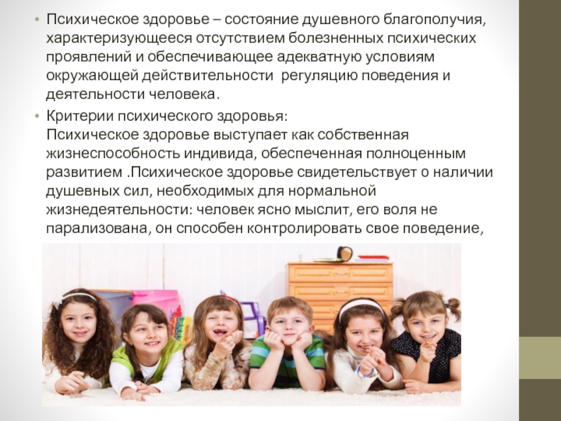Слайд 2Психическое здоровье – состояние душевного благополучия, характеризующееся отсутствием болезненных психических проявлений