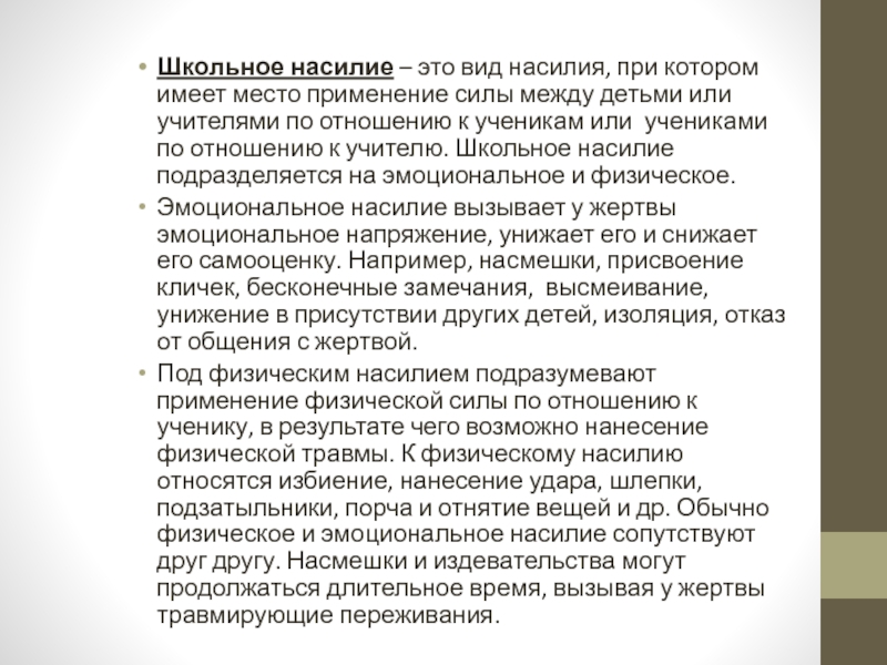между детьми или учителями по отношению к ученикам или учениками по отношению к учителю. Школьное насилие подразделяется на эмоциональное и физическое.