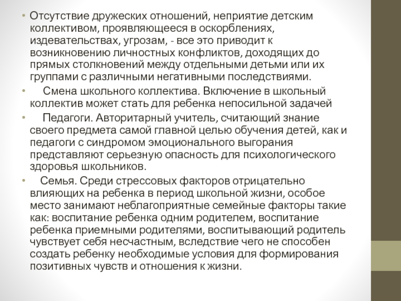 Слайд 7Отсутствие дружеских отношений, неприятие детским коллективом, проявляющееся в оскорблениях, издевательствах, угрозам,