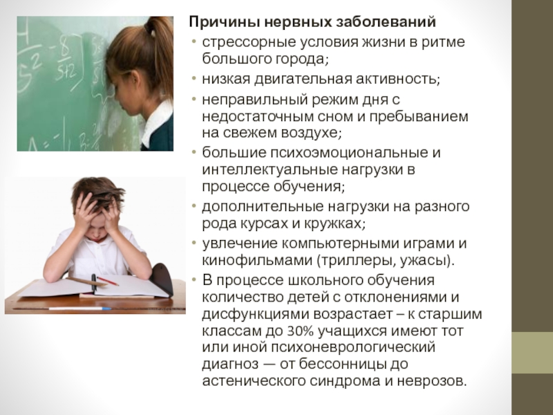 В процессе школьного обучения количество детей с отклонениями и дисфункциями возрастает – к старшим классам до 30% учащихся имеют тот или иной психоневрологический диагноз — от бессонницы до астенического синдрома и неврозов.