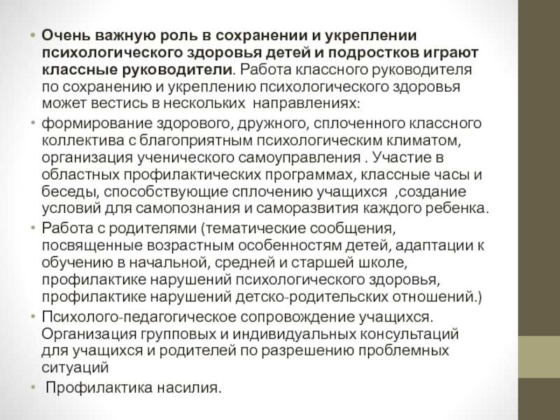 подростков играют классные руководители. Работа классного руководителя по сохранению и укреплению психологического здоровья может вестись в нескольких направлениях: