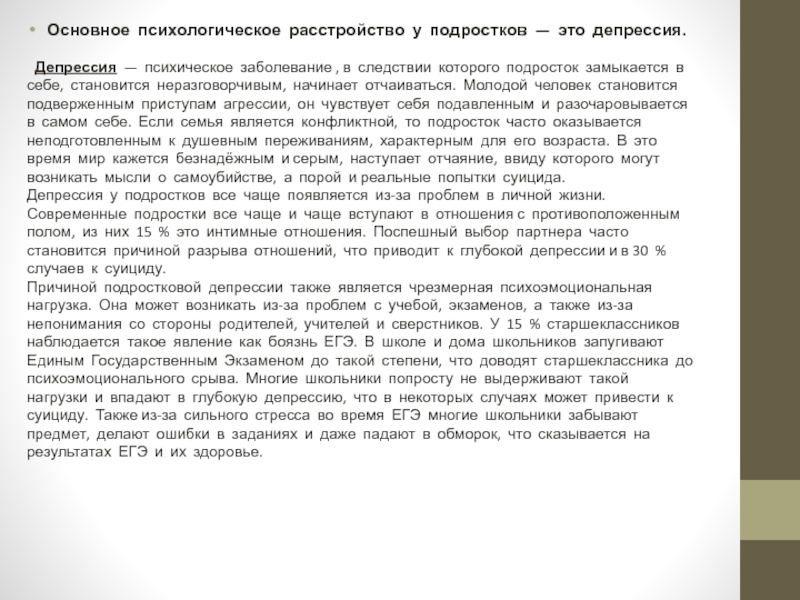 Слайд 4Основное психологическое расстройство у подростков — это депрессия.