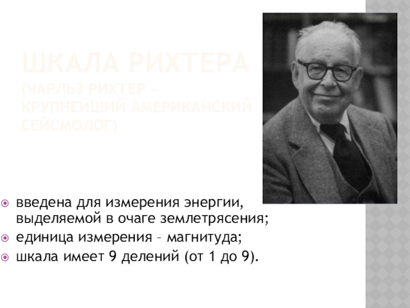 Шкала рихтера (чарльз рихтер –  крупнейший американский  сейсмолог) введена для измерения энергии, выделяемой в очаге