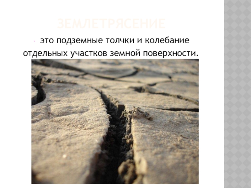 Землетрясение это подземные толчки и колебаниеотдельных участков земной поверхности.