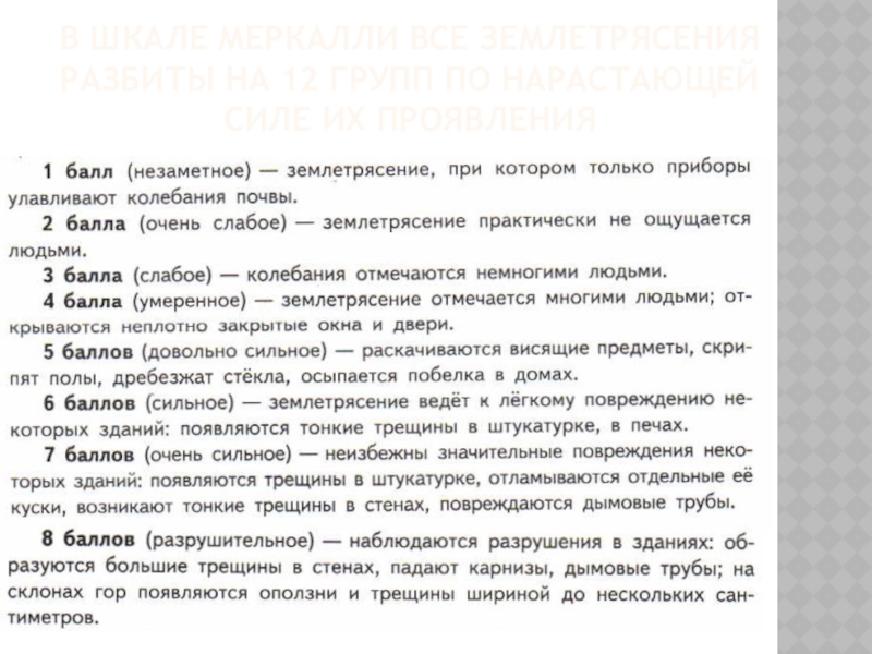 Слайд 7в шкале меркалли Все землетрясения разбиты на 12 групп по нарастающей