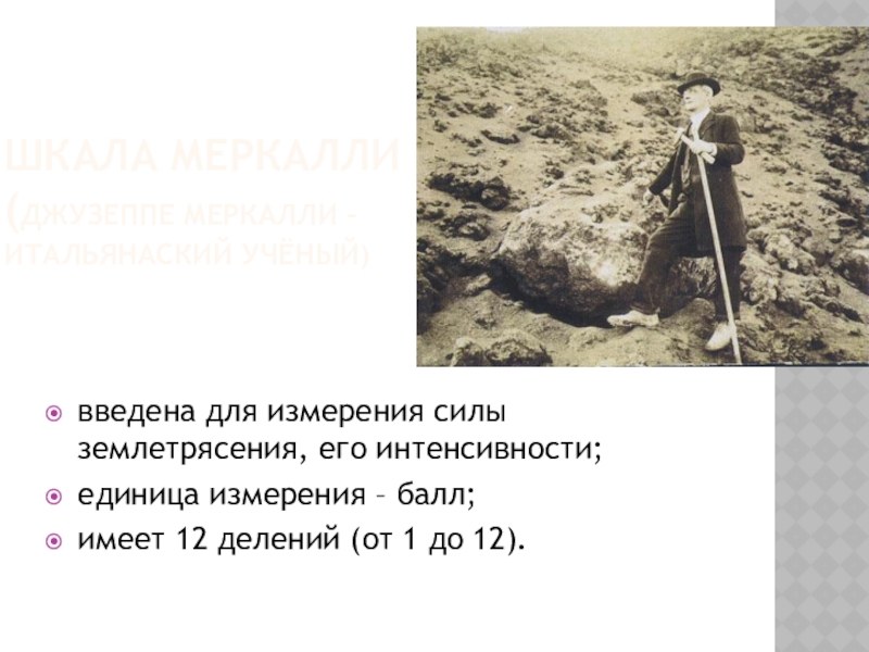 Шкала меркалли (Джузеппе меркалли – итальянаский учёный) введена для измерения силы землетрясения, его интенсивности;единица измерения – балл;имеет