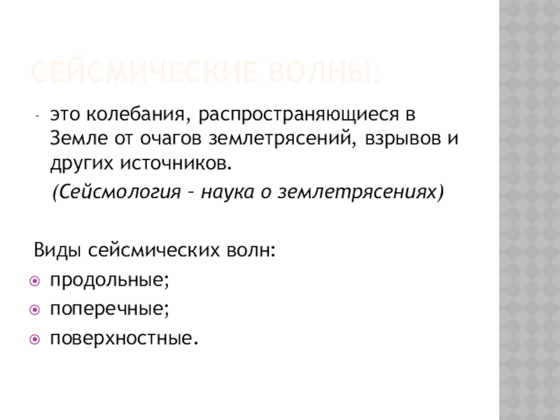 Сейсмические волны:это колебания, распространяющиеся в Земле от очагов землетрясений, взрывов и других источников.  (Сейсмология – наука