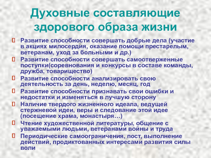 Духовные составляющие здорового образа жизниРазвитие способности совершать добрые дела (участие в акциях милосердия, оказание помощи престарелым, ветеранам,