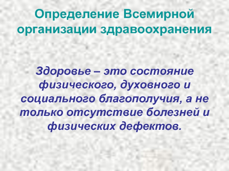 Определение Всемирной организации здравоохраненияЗдоровье – это состояние физического, духовного и социального благополучия, а не только отсутствие болезней