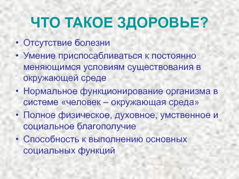 ЧТО ТАКОЕ ЗДОРОВЬЕ?Отсутствие болезниУмение приспосабливаться к постоянно меняющимся условиям существования в окружающей средеНормальное функционирование организма в системе