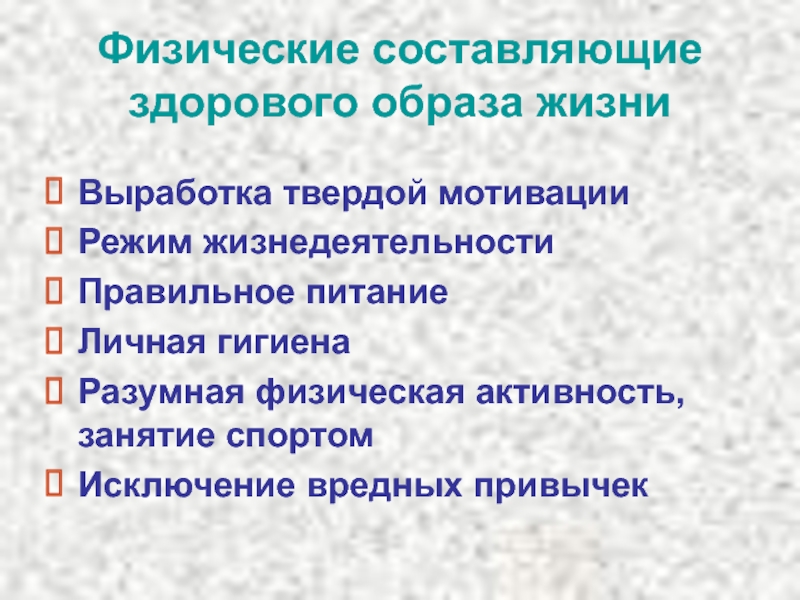 Физические составляющие здорового образа жизниВыработка твердой мотивацииРежим жизнедеятельностиПравильное питаниеЛичная гигиенаРазумная физическая активность, занятие спортомИсключение вредных привычек