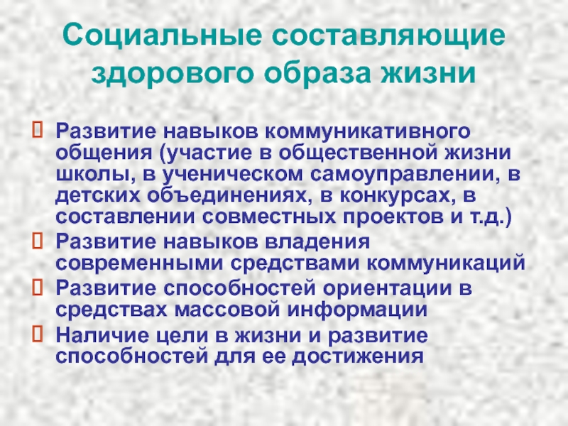 Социальные составляющие здорового образа жизниРазвитие навыков коммуникативного общения (участие в общественной жизни школы, в ученическом самоуправлении, в
