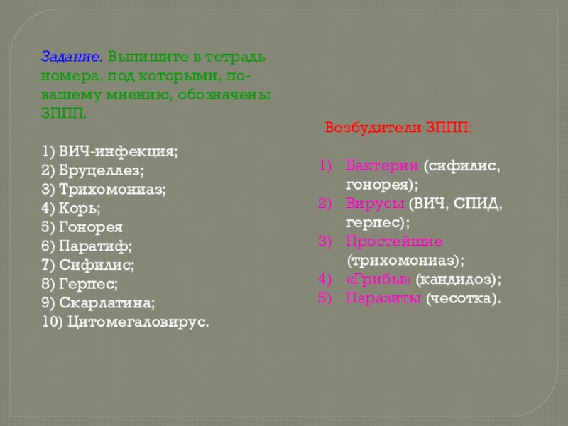 Слайд 6Задание. Выпишите в тетрадь номера, под которыми, по-вашему мнению, обозначены ЗППП.