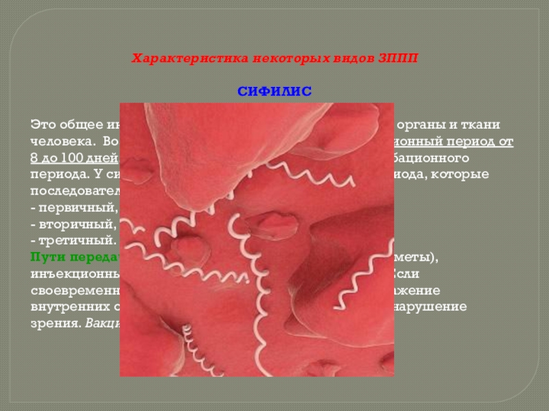 ткани человека. Возбудитель бледная трепонема. Инкубационный период от 8 до 100 дней. Больной заразен с третьей недели инкубационного периода. У сифилиса различают три клинических периода, которые последовательно сменяют друг друга: