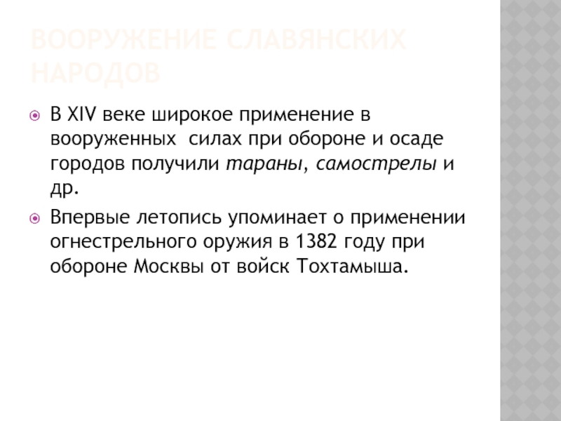 Впервые летопись упоминает о применении огнестрельного оружия в 1382 году при обороне Москвы от войск Тохтамыша.