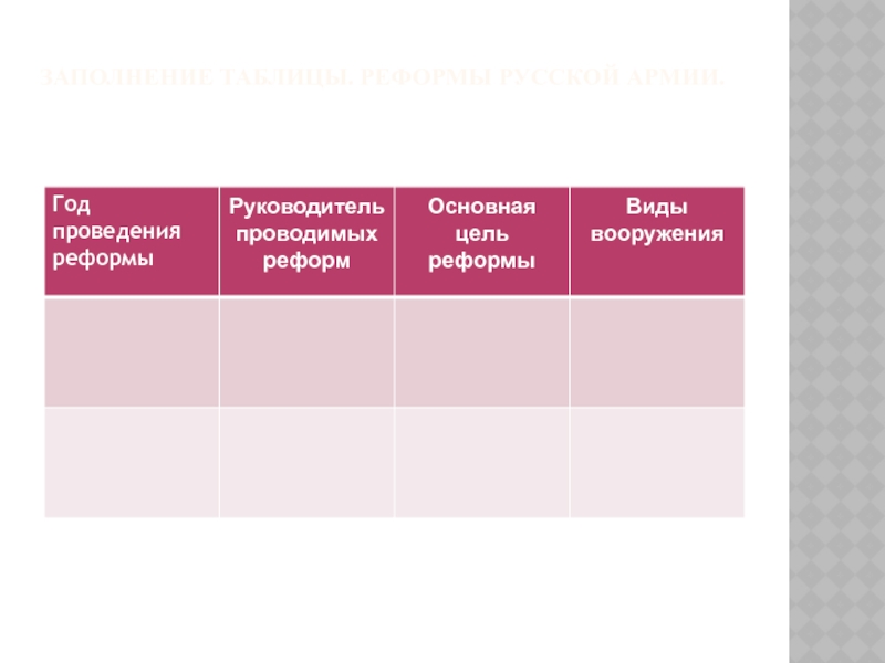 ЗАПОЛНЕНИЕ ТАБЛИЦЫ. РЕФОРМЫ РУССКОЙ АРМИИ.