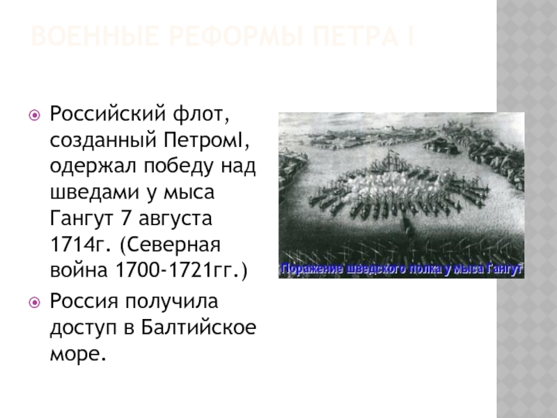 Слайд 12ОСНОВНОЕ СОДЕРЖАНИЕ ВОЕННЫХ РЕФОРМ ПЕТРА I СВОДИЛОСЬ К СЛЕДУЮЩЕМУ