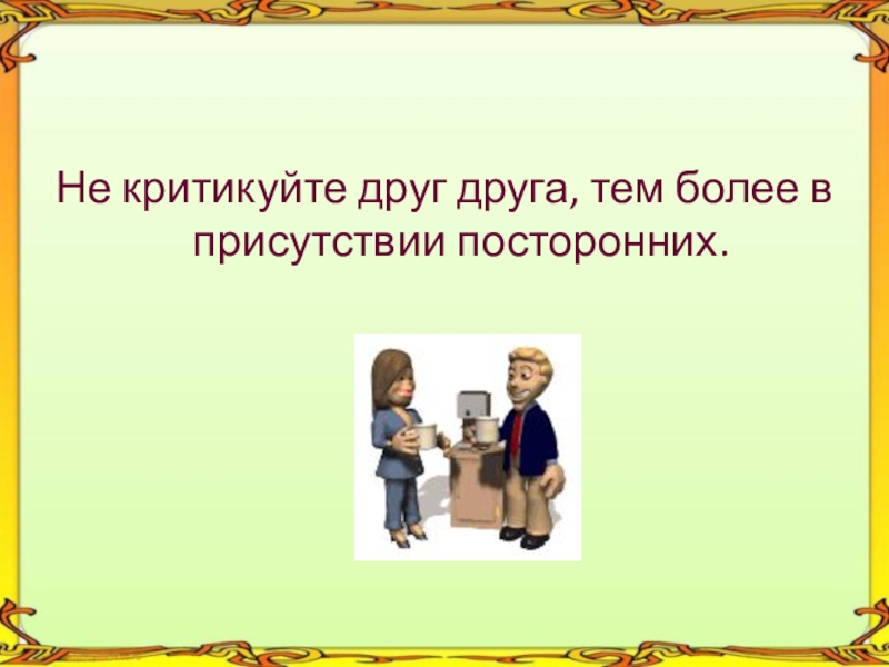 Слайд 42Не критикуйте друг друга, тем более в присутствии посторонних.