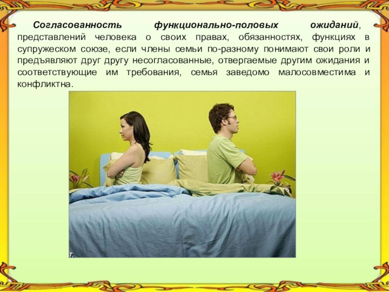 супружеском союзе, если члены семьи по-разному понимают свои роли и предъявляют друг другу несогласованные, отвергаемые другим ожидания и соответствующие им требования, семья заведомо малосовместима и конфликтна.