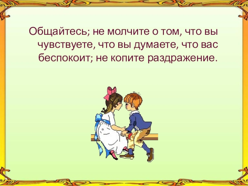 Слайд 46Общайтесь; не молчите о том, что вы чувствуете, что вы думаете,