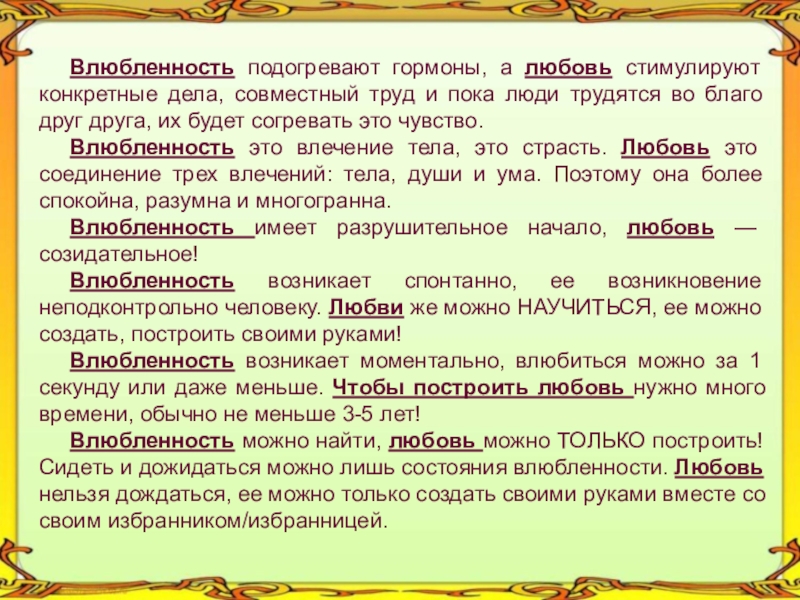 Слайд 26Влюбленность подогревают гормоны, а любовь стимулируют конкретные дела, совместный труд и