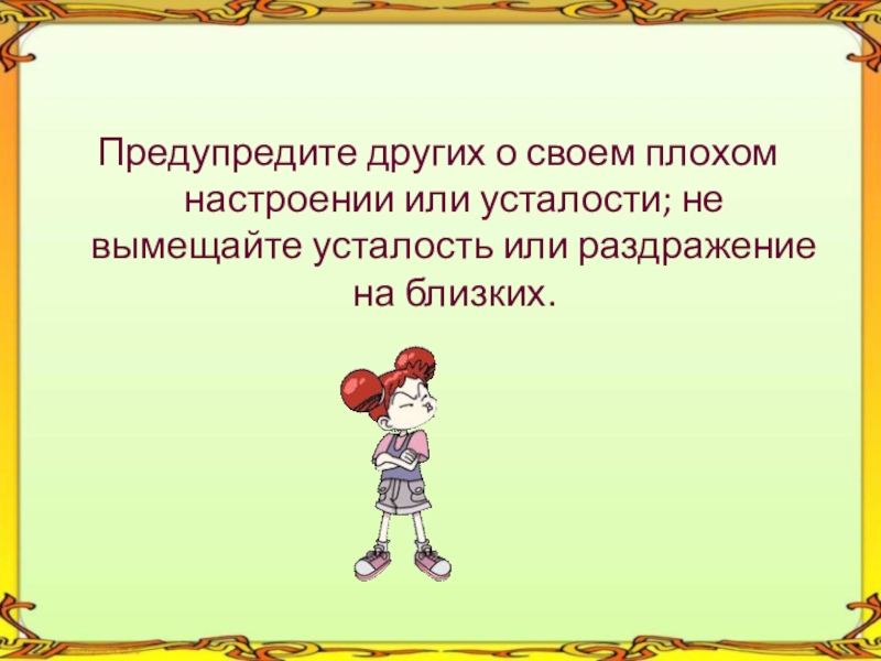 Слайд 49Предупредите других о своем плохом настроении или усталости; не вымещайте усталость