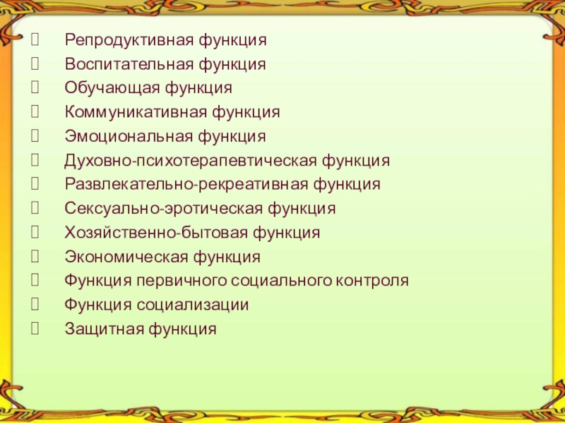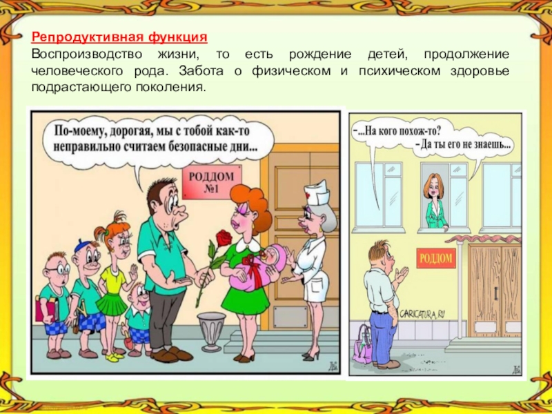 семьи. Обеспечение биологического воспроизводства общества, благодаря чему семьи превращаются в роды, идущие в поколения