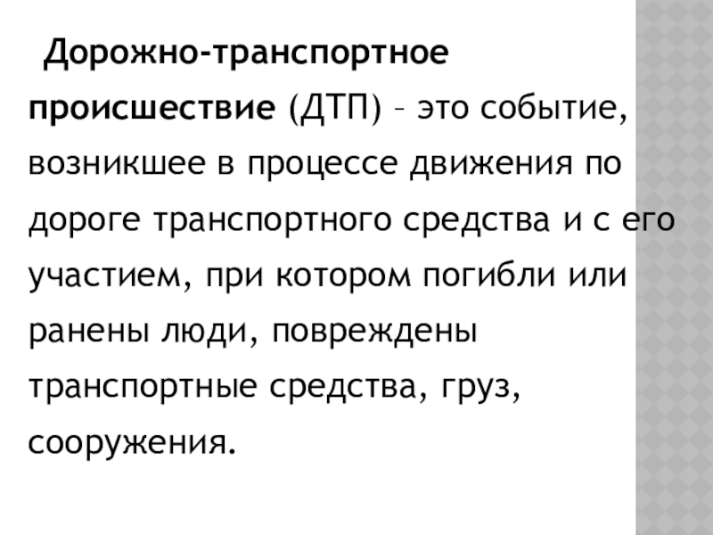 Слайд 3 Дорожно-транспортное происшествие (ДТП) – это событие, возникшее в процессе движения по